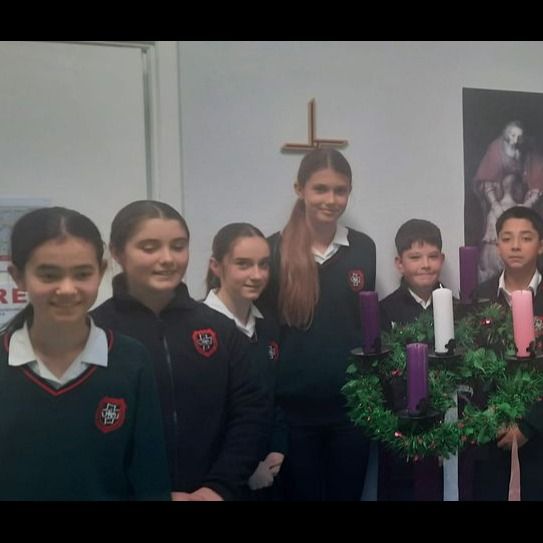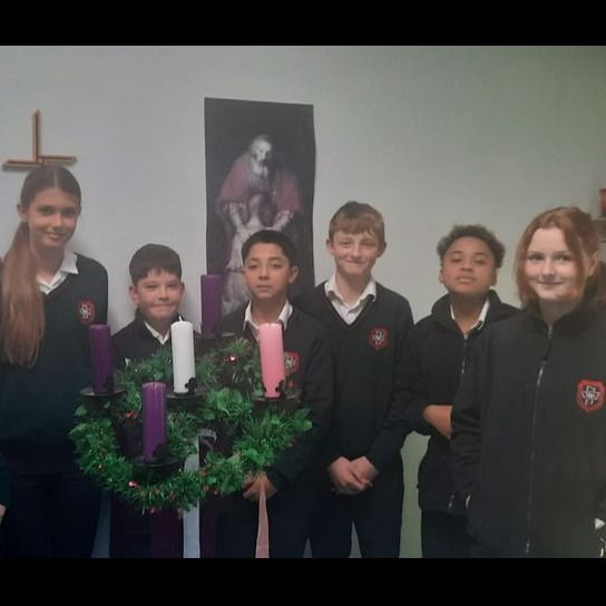 1st year students preparing for Advent by helping to make the school Advent Wreath.