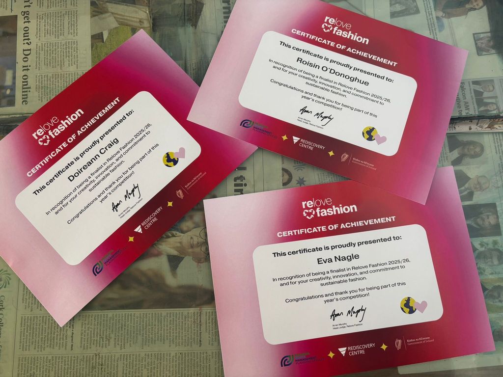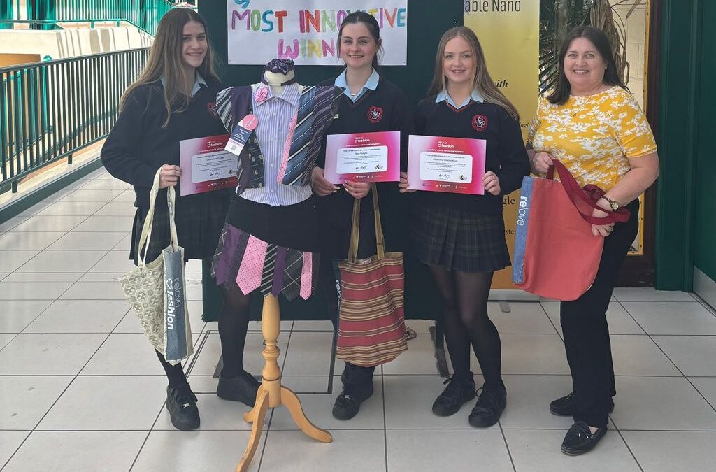 The art Department is delighted to announce that “Spotted in Style”, by TY students, Doireann Craig, Roisín O’Donoghue and Eva Nagle  have received an award in the National Finals in Dublin : Best Innovative in the Southern region . We would like to congratulate the team on their hard work on their designing and creativity in their use of preloved clothing .